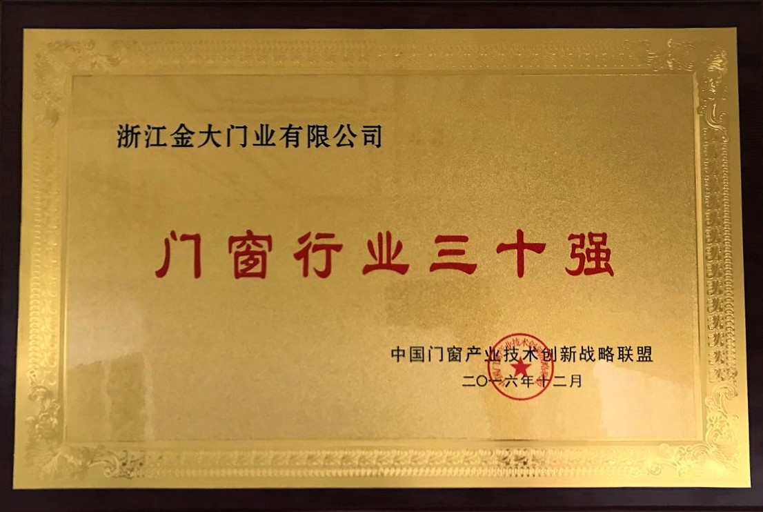 金大门业荣膺中国“门窗行业三十强”
