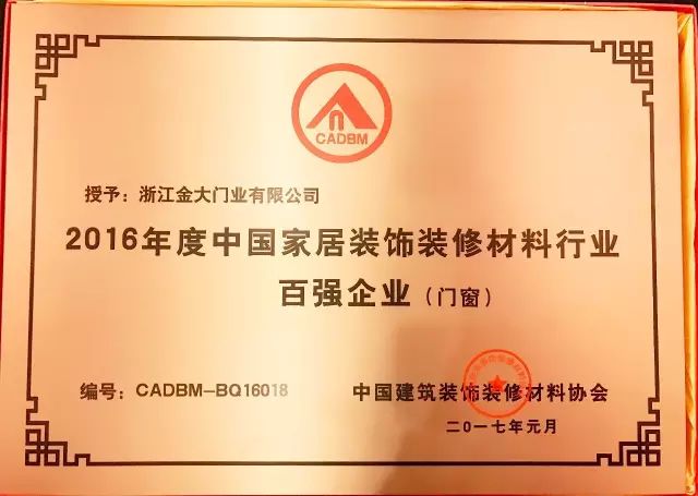 品牌铸就荣耀 金大门业荣获“2016年度中国家居装饰装修材料行业百强企业”